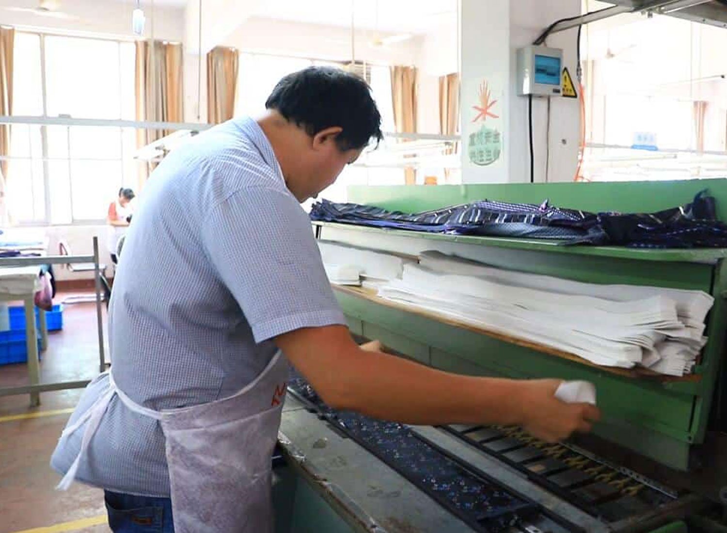 Fabric Cutter, a master of fabric cutting with vast experience. Known for high cutting efficiency and precision, ensures the quality of ties.